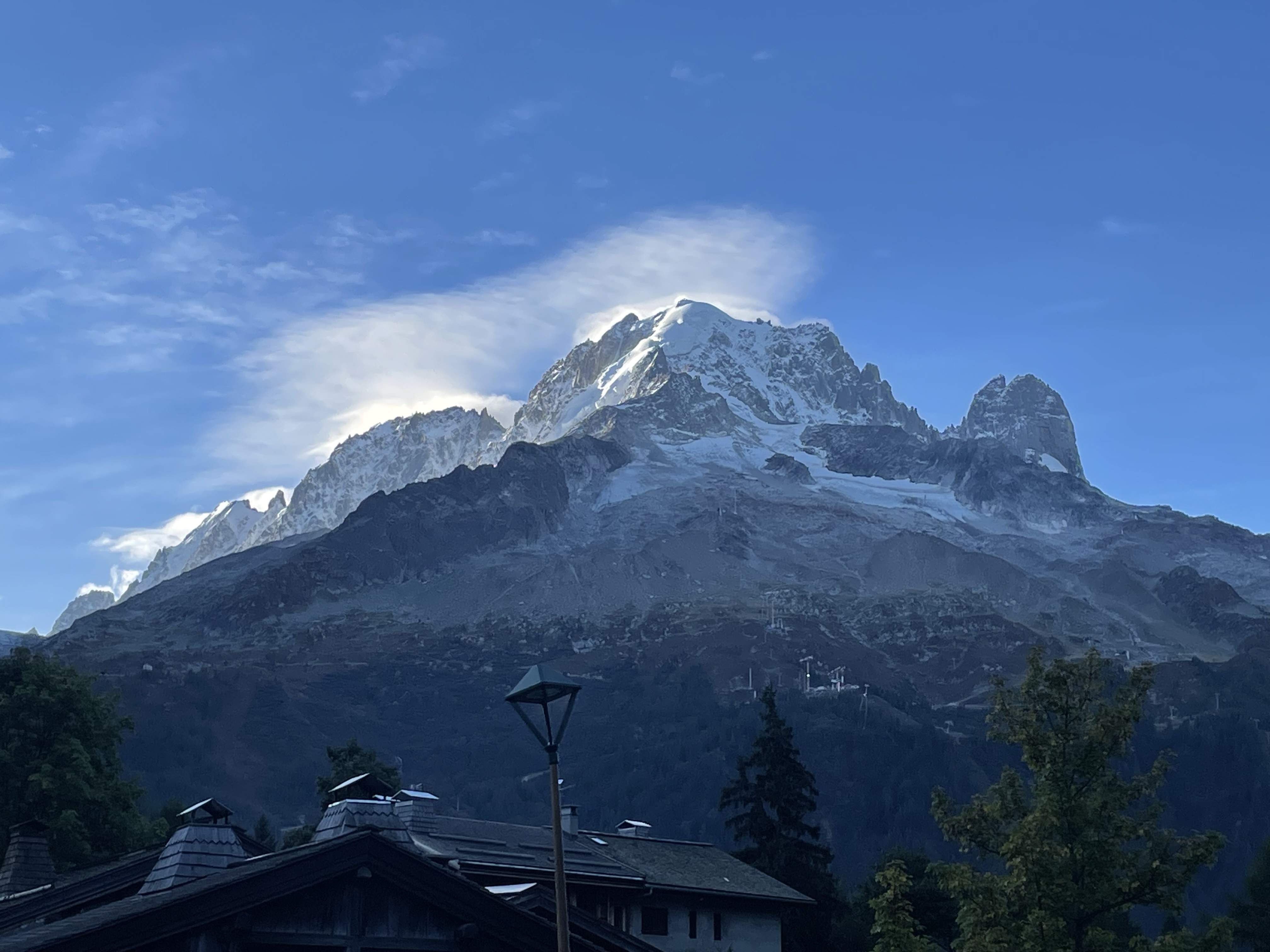 I'm done, and I'm tired, so I'll keep it short. Today was a perfect weather day and I kept taking pictures of Mont Blanc, which was, unusually, totally in the clear all day. I hiked Le Brevent, which is a neat mountain and one which I did in much less ideal weather about ten years ago. I got quiche and a beer at a "refuge" on the way down. Now I'm going out for dinner with some friends I met on the trail, who also finished today. All is well.