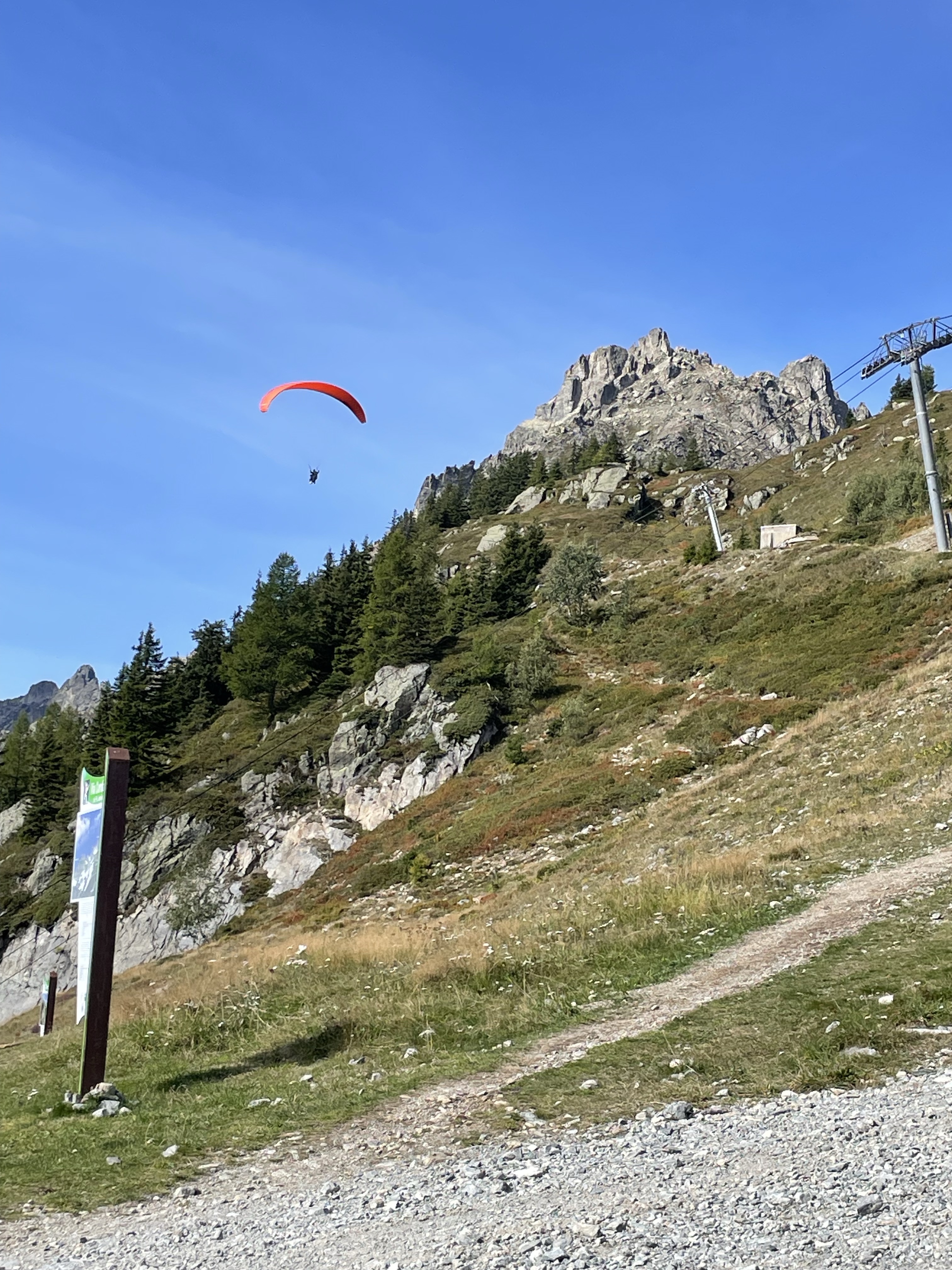 Today I climbed up to Lac Blanc, a small lake 7,700 feet up on the ridge of mountains just to the north of the Mont Blanc massif. There were a few steep spots where they had installed metal ladders to climb up, which made things a little interesting. There were good views of the massif, but Mont Blanc itself remained in the clouds. I then gradually headed down the ridge, descending until I got to Chamonix. I started to see more signs of civilization, like paragliders and tourists hiking up from where they had been dumped out of a ski gondola. Tomorrow I'll do what is basically a long day hike up a mountain called Le Brevent further down the ridge I was on today, then down to where I started in Les Houches, a village just south of Chamonix. That will officially complete my tour.